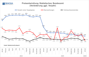 Die Preisentwicklung für den Verzehr einer Hauptspeise in der Gastronomie lag nach Angaben des Statistischen Bundesamts im Januar 2026 bei einem Plus von 3,0 Prozent gegenüber dem Vorjahr. Das Niveau blieb damit im Vergleich zum Vormonat Dezember unverändert. Gleichzeitig nahm aber auch der Preisauftrieb bei den Nahrungsmitteln wieder zu. Diese waren im Januar 2026 um 2,1 Prozent teurer als im Vorjahresmonat (Dezember 2025: +0,8%). Besonders stark stiegen die Preise bei Rind- und Kalbfleisch mit einem Zuwachs von 14,9 Prozent.